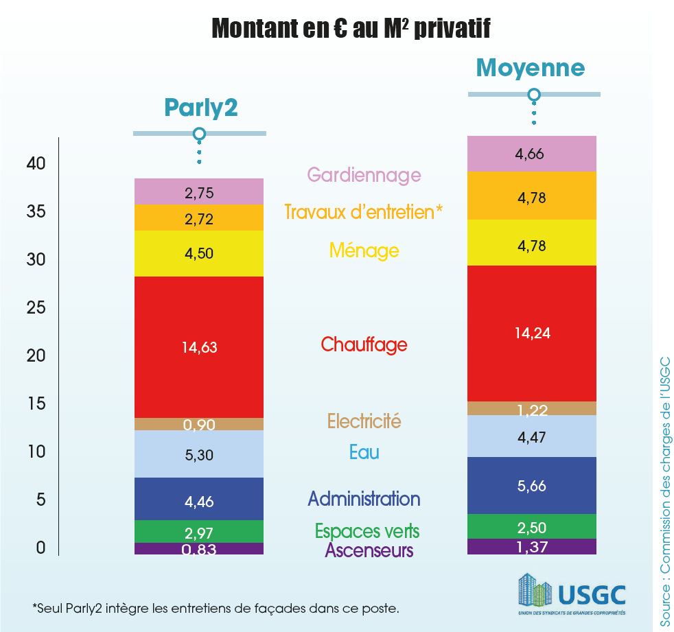 L’Union des Syndicats de Grandes Copropriétés – USGC – a comparé le niveau de charges de 20 copropriétés de l’Ouest parisien, offrant le même type de prestations que celui de Parly2 en 2023.