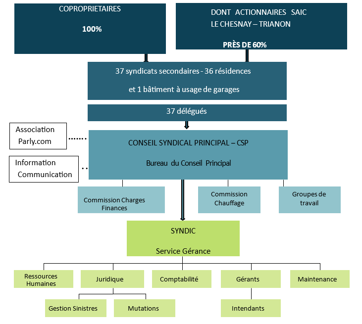Depuis l’achèvement de la construction de l’ensemble immobilier de Parly 2, la gestion de cet ensemble avait été assurée par la SAIC choisie tant par le Syndicat Principal que par les Syndicats Secondaires comme syndic bénévole. Cette tâche est depuis plusieurs années, pour des raisons fiscales, confiée à un syndic professionnel, la SCC.